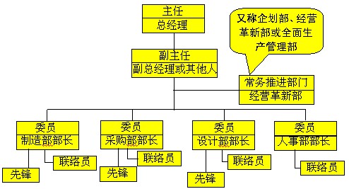 如圖所示,在持續改善管理委員會中,由總經理擔任主任,副總經理或其他愿意變革的人擔任副主任。常務推進部門負責全面推進或跨部門推進課題,在國內企業中又稱為企劃部或全面生產管理部等。每個部門都必須有先鋒和聯絡員,由先鋒做起,樹立模范榜樣,然后水平推廣,進行跨部門的改善。