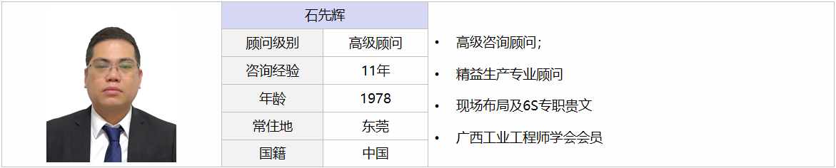 擅長業(yè)務:精益生產(chǎn)、成本控制、車間布局、IE改善、生產(chǎn)效率改善、品質(zhì)提升、自動化設備革新、計件報工系統(tǒng)改善、績效考核、年度經(jīng)營戰(zhàn)略、5S管理、目視化、六西格瑪、流程梳理等;