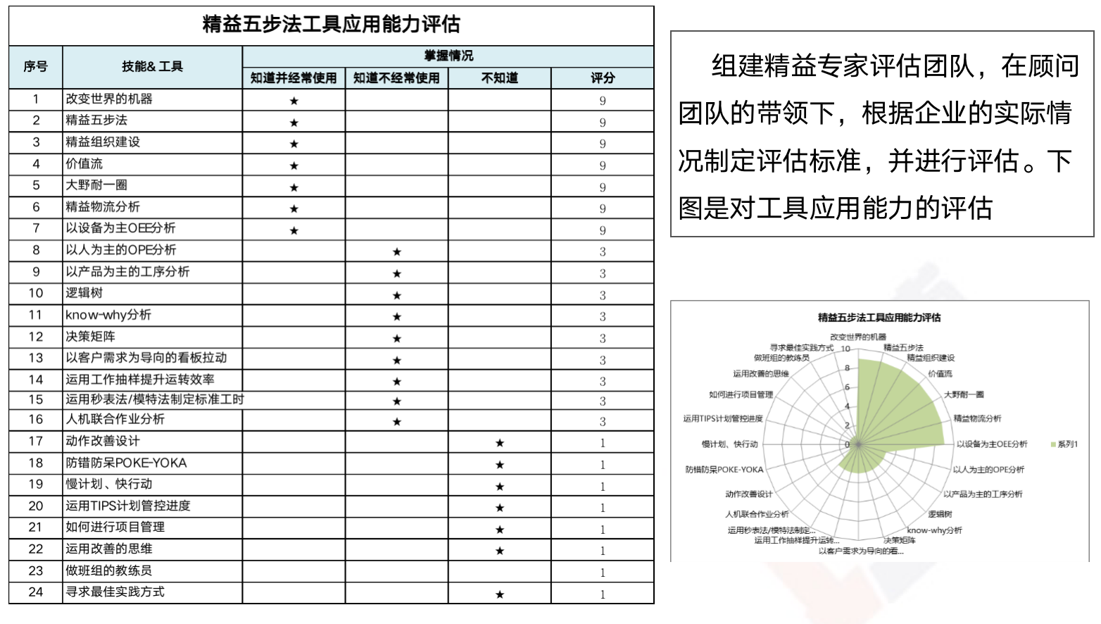 從精益五步法“準備、診斷、設計、計劃實施、持續改善” 和自我管理、團隊管理、業務管理等方面,梳理各層級人員應該掌握的技能;