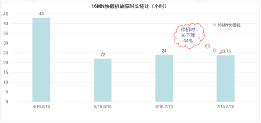 金航鈦業(yè)2023年關(guān)鍵設(shè)備快鍛機(jī)因設(shè)備故障停機(jī)4個(gè)月,2024年導(dǎo)入TPM活動(dòng)之后,每月的停機(jī)時(shí)長(zhǎng)逐步縮減。