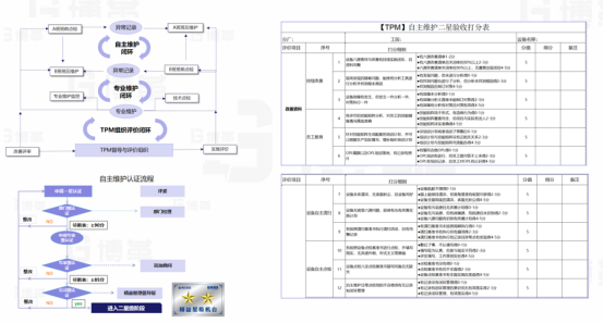 第四步完善自主維護(hù)認(rèn)證體系,搭建可持續(xù)維持的自主維護(hù)現(xiàn)場(chǎng)。通過現(xiàn)場(chǎng)認(rèn)證,員工能清晰感知什么才是做到位的,哪些地方可以再進(jìn)一步優(yōu)化,評(píng)分不是目的,完善自我認(rèn)證體系才是最終目的。
