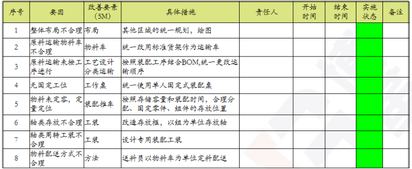 ●等待浪費:組件的安裝沒有按照定時定量的方式裝配、裝配好沒有放在固定區域,造成等待