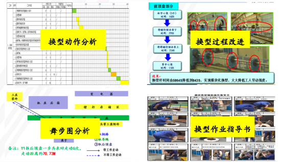 6)快速換模:通過換形動作分析,換形過程中舞步圖分析,制定換形改善方案,并建立換形標準作業指導書,換形時間由221分鐘降低至55分鐘。