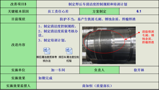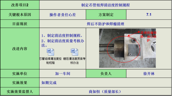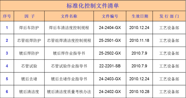 5)芯管組焊方法,針對芯管焊后不防護和焊瘤清理問題,制定芯管組焊清潔度控制規(guī)程。