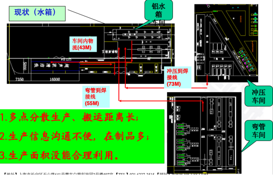 分析鋁水箱車間物流示意圖發現,鋁水箱沖壓至裝配工序物流距離73M,彎管工序至裝配車間55米。且存在多點分散生產、搬運距離長;生產信息溝通不便,在制品多;生產面積沒能合理利用等問題,因此重新調整生產布局,簡化物流路線。