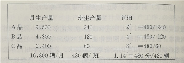 在這里,節拍時間是用一個班也就是480分鐘的生產量去除一個班的時間480分鐘得出的。根據這個計算結果,A品2分鐘生產一輛,B品4分鐘生產一輛,平均下來用1.14分鐘生產一輛即可。