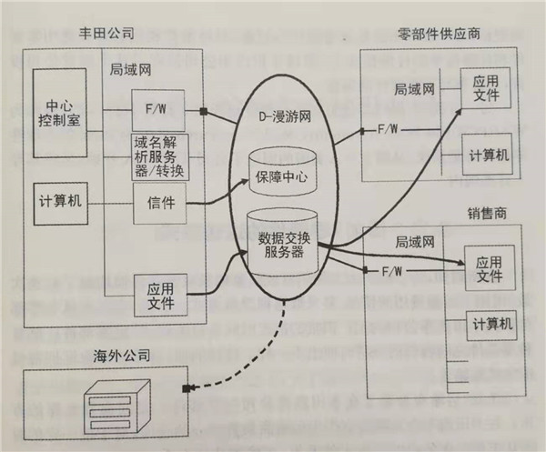 在豐田汽車公司,TDC開發(fā)了被稱為“D一漫游網”的豐田集團內部網絡,并通過它建立了豐田BtoB( Business to Business)系統(tǒng)的新TNS,所謂豐田集團內部網絡,雖然字面上稱為“內部網格”,但實際上就是一般所說的企業(yè)間的“外部網絡”。新TNS的基本結構如圖1所示,與原來相比,傳輸速度加快了,一個文件夾的容量也變大了,文件信息和圖像信息也可以傳輸了。