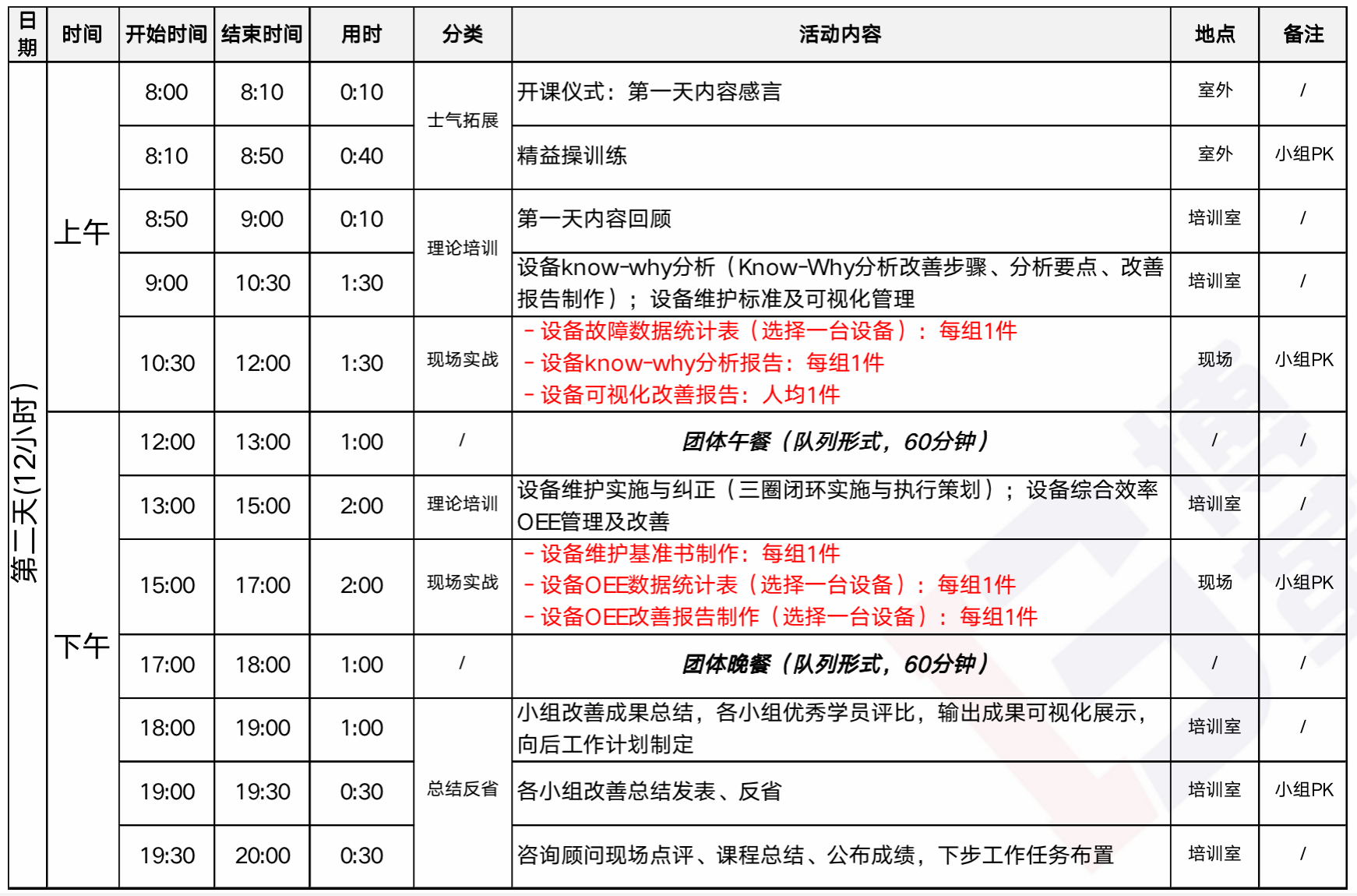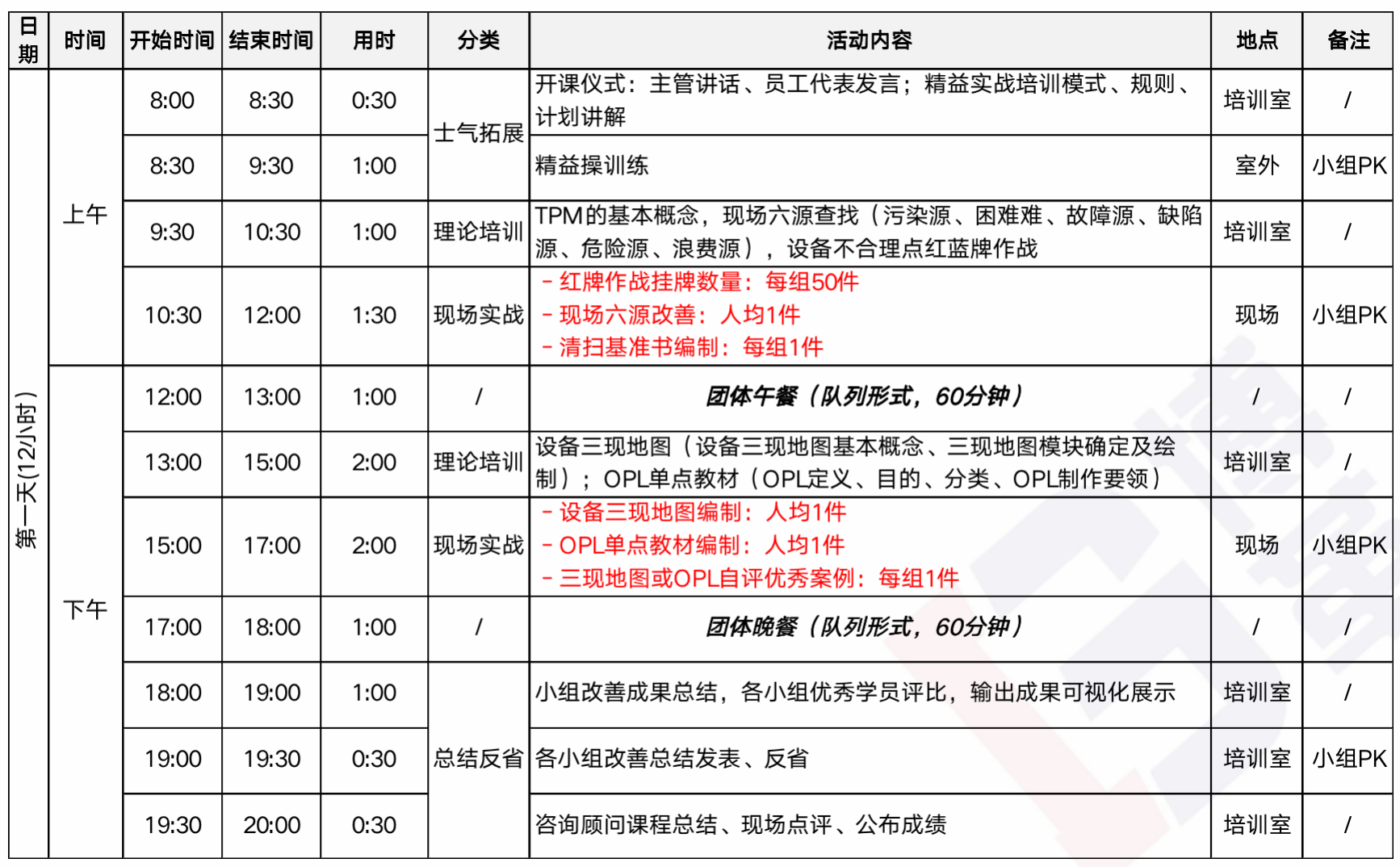 主題性:每次培訓(xùn)會根據(jù)企業(yè)的需求選擇不同的主題,包含但不限于:現(xiàn)場5S、TPM、標(biāo)準作業(yè)、六源改善、質(zhì)量改善、快速切換、產(chǎn)線平衡、工位布置、浪費識別與改善、QC/IE工具應(yīng)用等